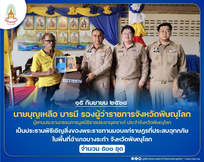 นายบุญเหลือ บารมี รองผู้ว่าราชการจังหวัดพิษณุโลก ผู้แทนประธานกรรมการมูลนิธิราชประชานุเคราะห์ ประจำจังหวัดพิษณุโลก เป็นประธานพิธีเชิญสิ่งของพระราชทานมอบแก่ราษฎรที่ประสบอุทกภัย ในพื้นที่อำเภอบางระกำ จังหวัดพิษณุโลก จำนวน ๕๐๐ ชุด