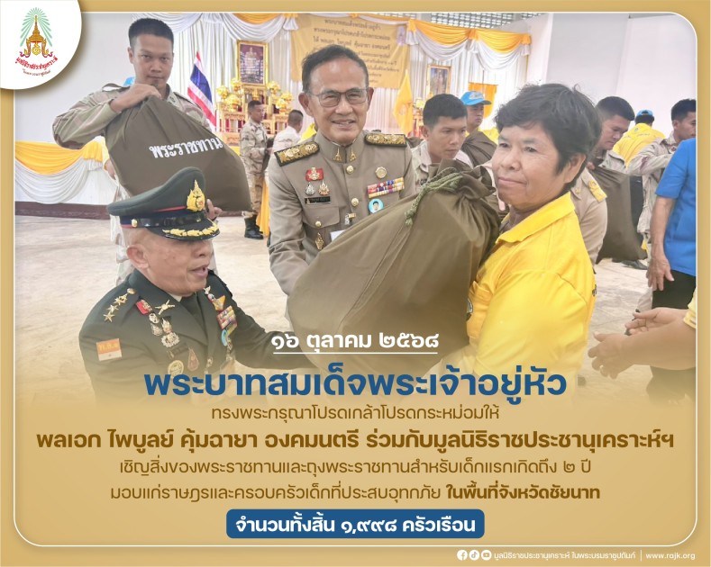 พระบาทสมเด็จพระเจ้าอยู่หัว ทรงพระกรุณาโปรดเกล้าโปรดกระหม่อมให้ พลเอก ไพบูลย์ คุ้มฉายา องคมนตรี ร่วมกับมูลนิธิราชประชานุเคราะห์ ในพระบรมราชูปถัมภ์ เชิญสิ่งของพระราชทานและถุงพระราชทานสำหรับเด็กแรกเกิดถึง ๒ ปี มอบแก่ราษฎรและครอบครัวเด็กที่ประสบอุทกภัย ในพื้นที่จังหวัดชัยนาท