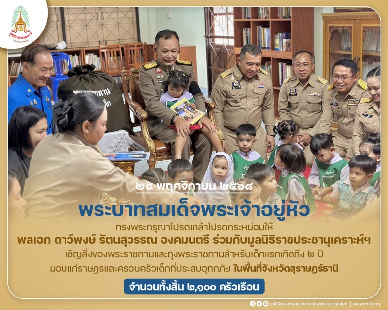 พระบาทสมเด็จพระเจ้าอยู่หัว ทรงพระกรุณาโปรดเกล้าโปรดกระหม่อมให้ พลเอก ดาว์พงษ์ รัตนสุวรรณ องคมนตรี ร่วมกับมูลนิธิราชประชานุเคราะห์ ในพระบรมราชูปถัมภ์ เชิญสิ่งของพระราชทานและถุงพระราชทานสำหรับเด็กแรกเกิดถึง ๒ ปี มอบแก่ราษฎรและครอบครัวเด็กที่ประสบอุทกภัย ในพื้นที่จังหวัดสุราษฎร์ธานี