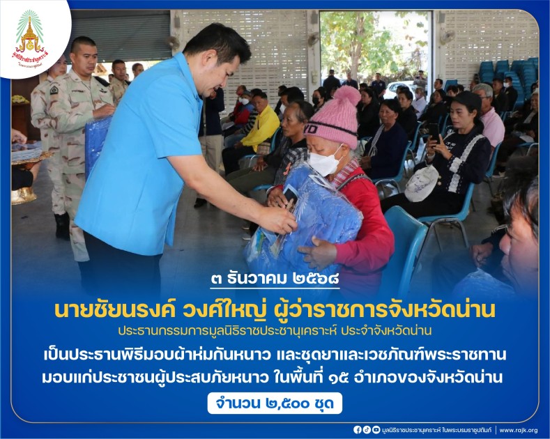 นายชัยนรงค์ วงศ์ใหญ่ ผู้ว่าราชการจังหวัดน่าน ประธานกรรมการมูลนิธิราชประชานุเคราะห์ ประจำจังหวัดน่าน เป็นประธานพิธีมอบผ้าห่มกันหนาวพระราชทานมอบแก่ประชาชนผู้ประสบภัยหนาว ในพื้นที่จังหวัดน่าน