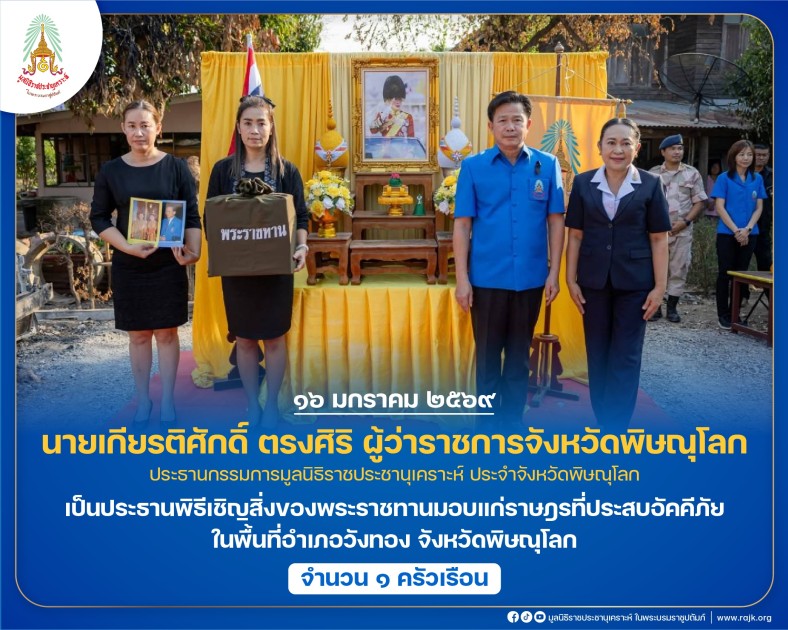 นายเกียรติศักดิ์ ตรงศิริ ผู้ว่าราชการจังหวัดพิษณุโลก ประธานกรรมการมูลนิธิราชประชานุเคราะห์ ประจำจังหวัดพิษณุโลก เป็นประธานพิธีเชิญสิ่งของพระราชทานมอบแก่ราษฎรที่ประสบอัคคีภัย ในพื้นที่อำเภอวังทอง จังหวัดพิษณุโลก จำนวน ๑ ครัวเรือน
