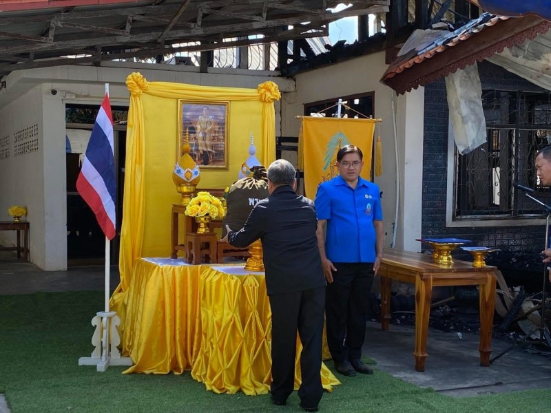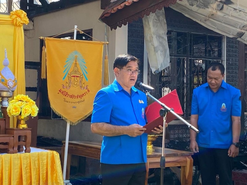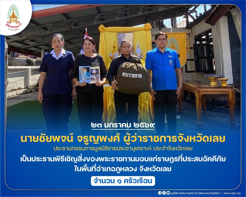 นายชัยพจน์ จรูญพงศ์ ผู้ว่าราชการจังหวัดเลย ประธานกรรมการมูลนิธิราชประชานุเคราะห์ ประจำจังหวัดเลย เป็นประธานพิธีเชิญสิ่งของพระราชทานมอบแก่ราษฎรที่ประสบอัคคีภัย ในพื้นที่อำเภอภูหลวง จังหวัดเลย จำนวน ๑ ครัวเรือน