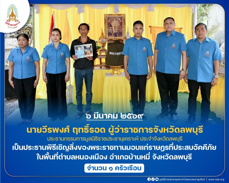 เป็นประธานพิธีเชิญสิ่งของพระราชทานมอบแก่ราษฎรที่ประสบอัคคีภัย ในพื้นที่ตำบลหนองเมือง อำเภอบ้านหมี่ จังหวัดลพบุรี จำนวน ๑ ครัวเรือน