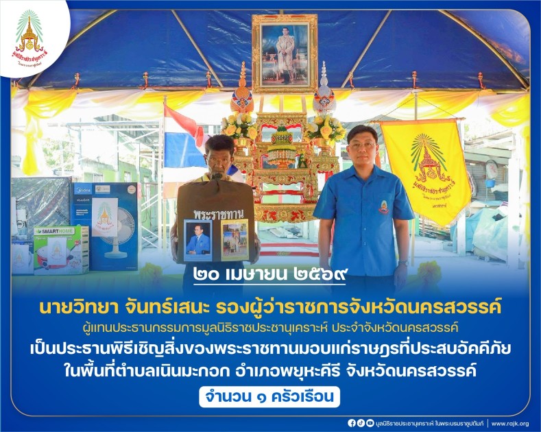 นายวิทยา จันทร์เสนะ รองผู้ว่าราชการจังหวัดนครสวรรค์ ผู้แทนประธานกรรมการมูลนิธิราชประชานุเคราะห์ ประจำจังหวัดนครสวรรค์ เป็นประธานพิธีเชิญสิ่งของพระราชทานมอบแก่ราษฎรที่ประสบอัคคีภัยในพื้นที่ตำบลเนินมะกอก อำเภอพยุหะคีรี จังหวัดนครสวรรค์ จำนวน ๑ ครัวเรือน