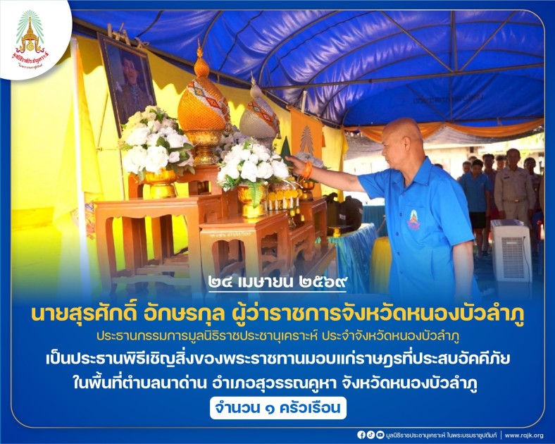 นายสุรศักดิ์ อักษรกุล ผู้ว่าราชการจังหวัดหนองบัวลำภู ประธานกรรมการมูลนิธิราชประชานุเคราะห์ ประจำจังหวัดหนองบัวลำภู เป็นประธานพิธีเชิญสิ่งของพระราชทานมอบแก่ราษฎรที่ประสบอัคคีภัย ในพื้นที่ตำบลนาด่าน อำเภอสุวรรณคูหา จังหวัดหนองบัวลำภู จำนวน ๑ ครัวเรือน